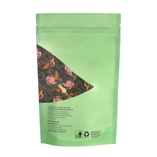 As a black tea blend, this combination combines the sweetness of apple, the intensity of almonds, and the warm, spicy profile of cinnamon. It becomes a savory and profound delight, thanks also to the finishing touch of rosebuds, which decorate and release a refined floral note.