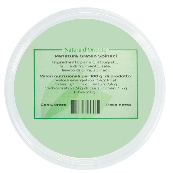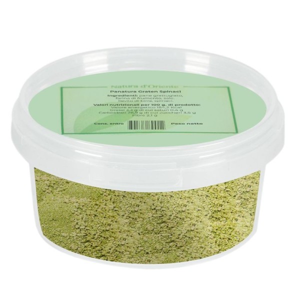 A preparation for gratins based on wheat flour, breadcrumbs and spinach, a breading flavored with vegetables which is an ideal complement for quickly preparing fish and meat dishes.