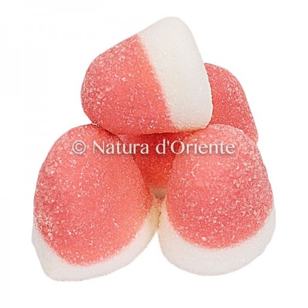 These gummy and fizzy candies resemble a small slice of watermelon. The delicious treat of a refreshing summer dessert is remembered by the flavor of these candies.