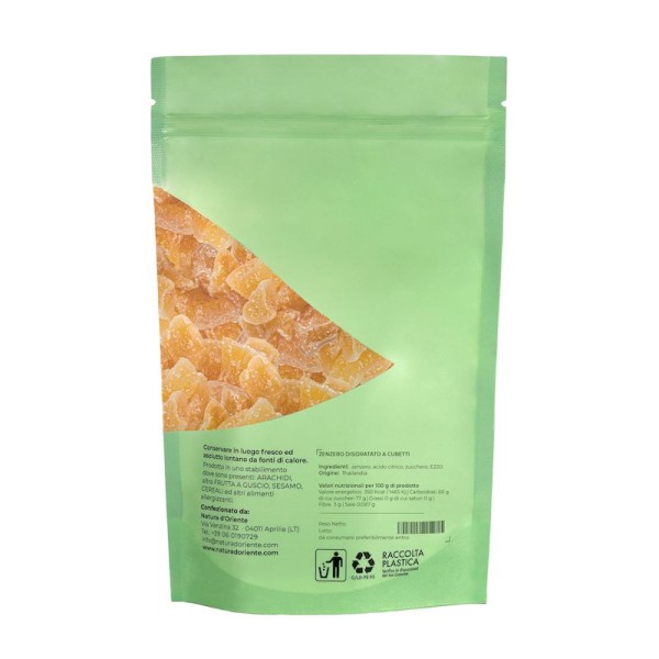 Perfect as a snack, or as a top decoration for muffins, cupcakes, desserts and ice cream, this diced ginger is an energizing snack, as well as a support for those who want to avoid overeating between meals.