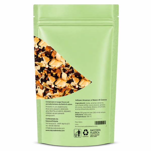 In addition to its particular flavor, this blend creates an infusion with remarkable beneficial qualities. Together, the two fruits boast important purifying, diuretic and energizing properties. The combination of pineapple and coconut is rich in elements that are important for our body: potassium, magnesium, iron, copper and manganese; in addition to vitamins C, A, K and vitamins of group B. Thanks to the vitamin content, enhanced by other foods, the infusion presents itself as the perfect ally to strengthen the immune system, counteracting seasonal ailments. On a nutritional level, coconut acts as a tonic, which can help us in moments of weakness, thanks to the numerous vitamins. It facilitates the functions of the digestive system, avoiding stomach problems and digestive difficulties. Together with other substances contained in the infusion, such as apple and sc
