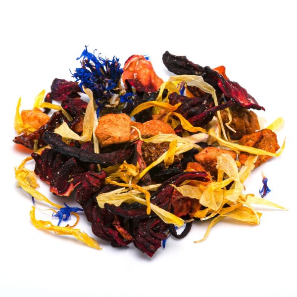With this invigorating blend, you can enjoy a real infusion of energy, accompanied by the exquisite exotic flavor of mango, coconut and other ingredients. It's a perfect way to start the day, evoking distant, Caribbean places with aromas that combine hibiscus, tropical fruits and citrus. These sweet, slightly tart and lively notes are combined with the soft nuances of marigold and cornflower for a floral finish. Also ideal as a cold fruit infusion in summer, thirst-quenching and invigorating when the heat hits. Perfect mid-day refresher. The satiating consistency of coconut, mango, papaya and apple makes this drink excellent to accompany a detox and slimming diet.