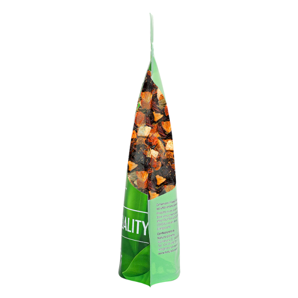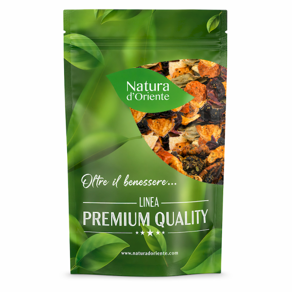 The components of the infusion are many, and the mixture contains fruits and flowers of various origins. The watermelonit comes from the Citrullus lanatus plant, which belongs to the Cucurbitaceae family (the same as some vegetables such as cucumber, pumpkin and melon). Plants in this family bear separate male and female flowers on the same plant. It presents itself with thin vines, covered with small hairs and branched. The plant produces solitary yellow flowers and large, spherical to oblong fruit. It is the edible part of the watermelon, given by the ripe ovary formed by watery pulp and hard rind. Watermelon is eaten as a fruit, but is still classified as a vegetable. Mint or Mentha is a herbaceous plant of the Lamiaceae family. It has up to 24 species, and many varieties, all with similar herbal properties. Many hybrids of mint are known, mainly used for food. The plant grows to about 1-2 meters tall, with the famous leaves displaying a serrated edge. It has a fleshy underground root (rhizome), and the flowers are born in thin spikes. Melon comes from the climbing plant Cucumis melo, of the pumpkin family (Cucurbitaceae). It grows well in temperate to warm climates, displaying large leaves and unisexual yellow flowers. Botanically, edible fruits are a type of berry with a hard rind, which varies in size, shape, texture and color (yellowish, white, brown, greenish, longitudinally striped). The flavor of the pulp can vary depending on the variety: some when ripe give off a sweet fruity smell, others are less sweet but softer. The Rose is a plant of the Rosaceae family, famous for its fragrant flowers, which vary according to the many varieties. Most rose species originate from Asia, and decline in thousands of cultivars. The plant can take the form of erect or climbing shrubs. The false fruit of the Rosa canina plant, called rosehip, appears as a red or orange berry. It contains achenes, the real fruits, and is a rich source of vitamin C. The apple fruit comes from the Malus domestica plant, belonging to the Rosaceae family. it is a tree native to Asia, widespread throughout the world for the nutritional value of its fruits. Apples are diversified in many colors and in numerous varieties, and have been used in human nutrition for millennia. The European Sambucus nigra plant belongs to the genus Sambucus (family Adoxaceae). it is a shrub widespread in Europe and western Asia, which grows in humid and sunny places. Elderberry trees reach a height of about 15 meters and can live for about 60 years. Each flower becomes a small purplish-black berry, valued for its nutritional properties. The hibiscus plant is the Hibiscus which belongs to the Malvaceae family. It comes in the form of numerous species of grasses, shrubs and trees. These plants are native to warm temperate and tropical regions. The colorful and striking hibiscus flowers last only one day. Known for their properties, they are used for infusions or to create dehydrated hibiscus.