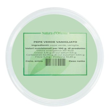 Vanilla green pepper from Borneo, as well as black, is produced from the unripe fruit of a plant of the Piperaceae family. In the drying process it is treated with sulfur dioxide in order to maintain the green color of the fruit. By far one of the most aristocratic and good pepper blends, which the panorama of spice producers offers.