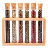 The glass pepper packaging allows you to taste different types of pepper, a mix of aromas and flavors to use in the kitchen when necessary and according to the recipes of the moment. Ideal among practical accessories but with a gourmet touch, the peppercorn containers are made with glass vials, to allow easy identification and dosing. The packaging with glass vials represents an "organizer" in the kitchen, which in addition to containing pepper, can later be used in a multifunctional way as a salt or spice holder. The base of the pepper set is made of wood, and holds 6 glass tubes fitted with a cork stopper closure - which retains the fragrance of the pepper. It is a spice rack with a practical pedestal, which you can display in the kitchen for its design and will be useful immediately: just open the test tube and immediately use the desired pepper.