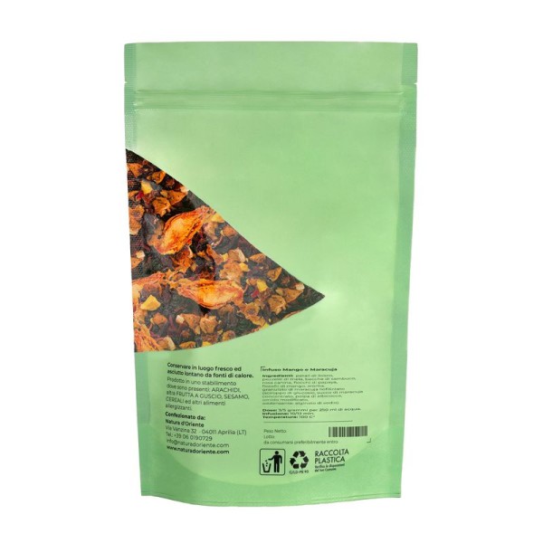 The infusion is obtained by placing approximately 3-5 grams of the mango and maracuja mixture with water at 100 °C in a cup (250 ml). Leave to infuse for 10 to 12 minutes before drinking. Add honey or sugar, if desired.