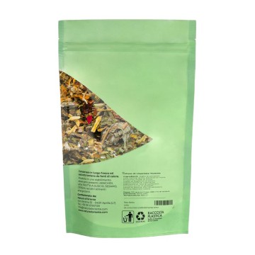 They support perspiration during cold alterations, to expel toxins, and are used as emollients and expectorants in cases of irritation of the respiratory system. Blackberry leaves also promote well-being against colds, sore throats, nasal congestion, wet cough. They help in the herbal tea to balance the temperatures and calm the tissues damaged by the irritated and excessive mucous membrane. Calendula petals have an emollient effect on the oropharyngeal mucosa, calming redness, as do mullein flowers, peony petals and sunflower petals (they contain saponins and antioxidants useful for reducing cough symptoms). natural anti-inflammatory, useful for respiratory tracts irritated by phlegm secretions, such as in the case of bronchitis. In our infusion, the toasted licorice root is accompanied by numerous other elements, which are also useful for the digestive system. The mix contains raspberry leaves, apple pieces, wild strawberry leaves, lemon balm.