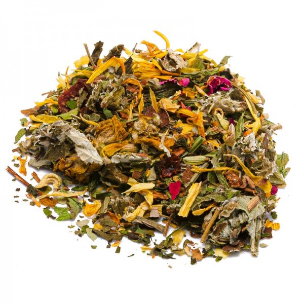 anise - Illicium verum, a tropical evergreen tree of the Schisandraceae family; the petals of Calendula officinalis is an annual and perennial plant, part of the Asteraceae family; raspberry leaves, of the Rubus idaeus L. plant, a fruit shrub of the Rosaceae family; dog rose is a plant that belongs to the Rosaceae family; the apple from the Malus domestica plant, belonging to the Rosaceae family; fennel from the botanical name Foeniculum vulgare, is a flowering plant of the Apiaceae (Umbelliferae) family; blackberry leaves, from the Rubus Fruticosus L. tree which belongs to the large Rosaceae family; the leaves of wild strawberries of the genus Fragaria, part of the Rosaceae family; the plantain or Plantago lanceolata is a perennial and spontaneous plant of the Plantaginaceae family; Sambucus flowers , a flowering plant belonging to the Adoxaceae family. The most common type is Sambucus nigra, also known as European elderberry or black elderberry. Melissa officinalis is an annual plant of the Lamiaceae family; sunflower petals, an annual plant Helianthus annuus belonging to the Asteraceae and native to North America; peony petals derive from the flowering plant of the genus Paeonia, the only genus of the Paeoniaceae family; mullein flowers or Verbascum thapsus, species of the Scrophulariaceae family; mint or Mentha, perennial plant of the Lamiaceae family widespread in many species, hybrids and varieties.