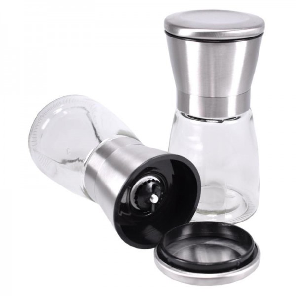 Each salt or pepper mill is easy to handle. May contain peppercorns, sea salt, Himalayan salt, dried chili peppers, etc. It becomes an important accessory when using fine salts or coarse peppercorns - recommended for all types of pepper. The mills stand on the glass base, with one attachment at the top, so the condiment doesn't stain the table or counter. They are filled with coarse salt or peppercorns, on top. The knob is adjustable, with different levels and fineness of grinding, from coarse to medium or fine. It rotates according to your taste, to grind to perfection. It fills up and empties quickly. After use, simply close the grinder with the cap. Besides being a high quality salt or pepper grinder, you could also use it for other spices.