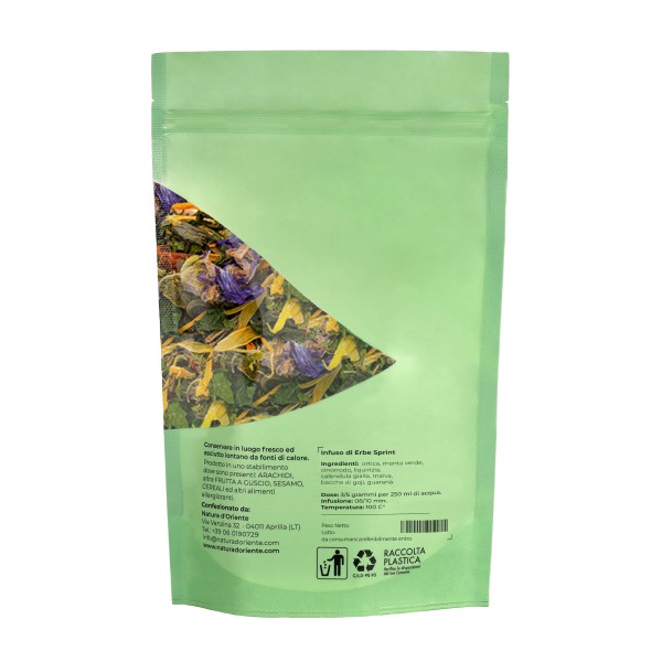The feeling of tiredness and lack of energy can slow down our daily activities and divert attention from what interests us. To get full of energy in a natural way, you can resort to a specific diet and support such as this combination of "sprint" herbs. The herbal tea promotes attention and concentration on a mental level, gives vigor to the body and counteracts states of stress and tiredness. Useful when you need to increase performance at work, in study or for your own interests, this mixture has the right doses of natural energizing bioactive compounds. The chosen mix contains a complex of herbs and vegetables such as: nettle, spearmint, rosehip, licorice, yellow marigold, mallow, goji berries, guarana.