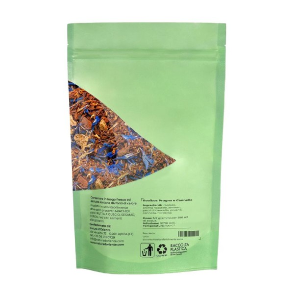A herbal tea based on rooibos enriched with plum and cinnamon, the plum gives the sweetness, so much so that there is no added sugar in the mixture, the cinnamon is also sweet but also has a pungent flavor that gives a sensation of warmth. Rooibos is also known as African red tea, but we should perhaps talk about false tea, because even if rooibos is very similar to tea both in flavor, and in preparation method, and in properties (with the advantage of not containing caffeine) in reality tea should only be called the infusions of an Asian plant called Camellia sinensis. Rooibos (in Afrikaans it means red bush) is obtained from a plant native to South Africa called Aspalathus linearis.
