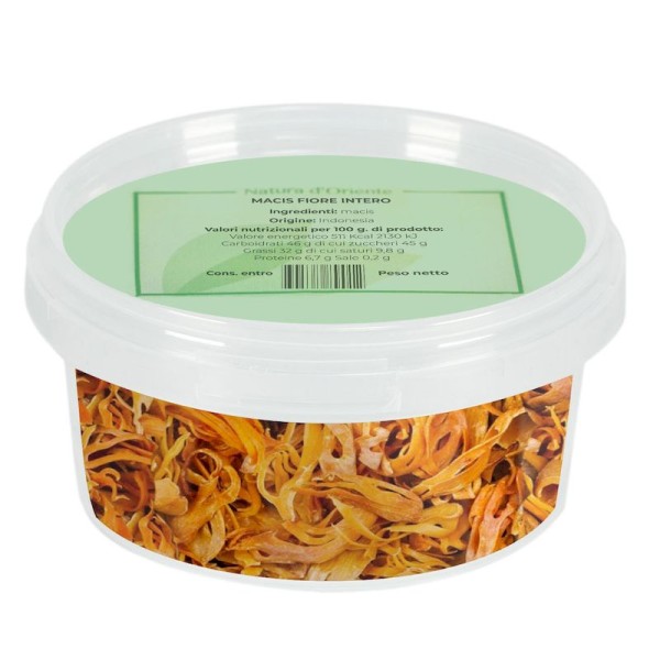 Also called mace or "nutmeg flower", mace in cooking is a prized spice, to be better understood to create increasingly refined aromatic suggestions. It spreads its characteristic scent intensely on many different dishes, both sweet and savoury. It is obtained from the outermost part of the nutmeg seed, the covering called aril. It appears as a fleshy membrane that envelops the seed and, in fact, can look like a peel. Mace is also related to nutmeg in its taste properties, but is more subtle, warm and refined. It introduces nuances of flavour and complex, floral and sweet aromas. However, it is not evanescent, it gives dishes a clear profile with notes that can evoke black pepper and pine. The whole mace flower version is excellent for preserving the power of the essential oils it contains, with benefits of purity at an aromatic level when it is ground fresh or added whole to recipes. In addition, mace adds a touch of color to foods thanks to its bright tone, which after drying becomes yellow-orange and resembles saffron.