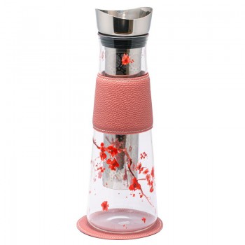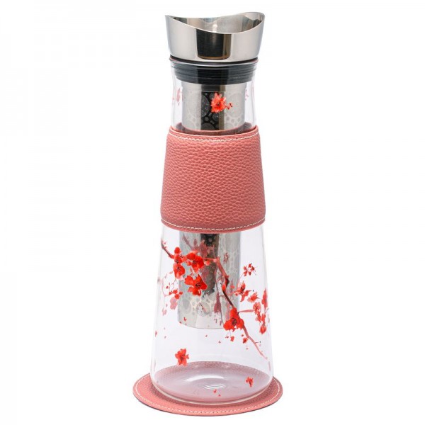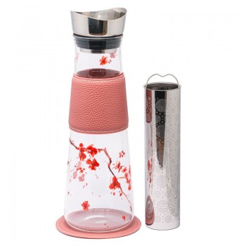 Grazie alla sua capacità (1,25 litri) e dimensione (100 x 300 mm), può portare le bevande in tavola per diverse persone, con uno stile unico. Dal punto di vista del design, la caraffa stupisce per gli splendidi fiori di ciliegio, foglie o eleganti geometrie che decorano l'interno. Si aggiunge la raffinata fascia-polsino sulla superficie, per la presa sicura dal calore, e un elegante sottobicchiere in pelle sintetica coordinato. Perfetta come regalo, la caraffa filtrante con infusore è dotata di una custodia abbinata, ed è disponibile in diversi colori: arancio, viola, celeste.