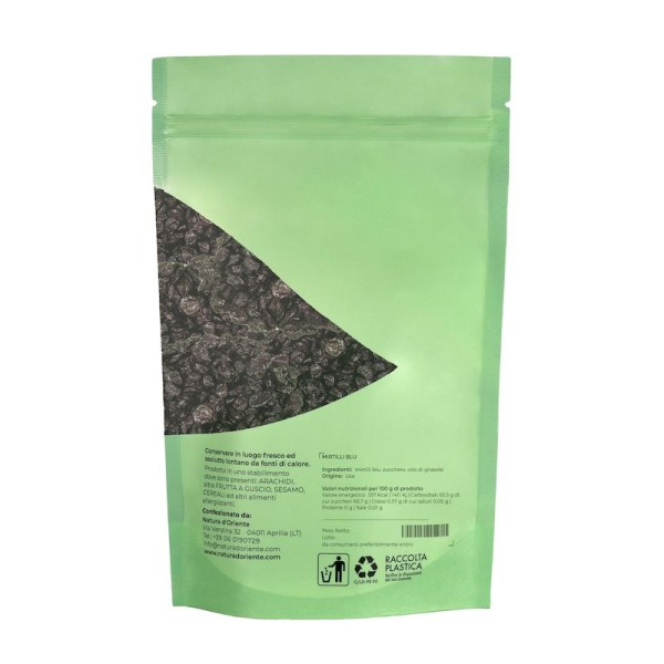 Questa versione di mirtilli secchi contiene diversi zuccheri e non eccessive calorie (332 per 100 grammi), oltre ad un buon contenuto di minerali, fibre (circa 5 g / 100 g), proteine (1,1 g / 100 g), e grassi.