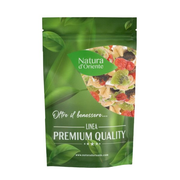 In questo caso, proponiamo un misto di frutta disidratata composta da pesche, kiwi, pere, ciliegie, cocco, mele, melone, uva.