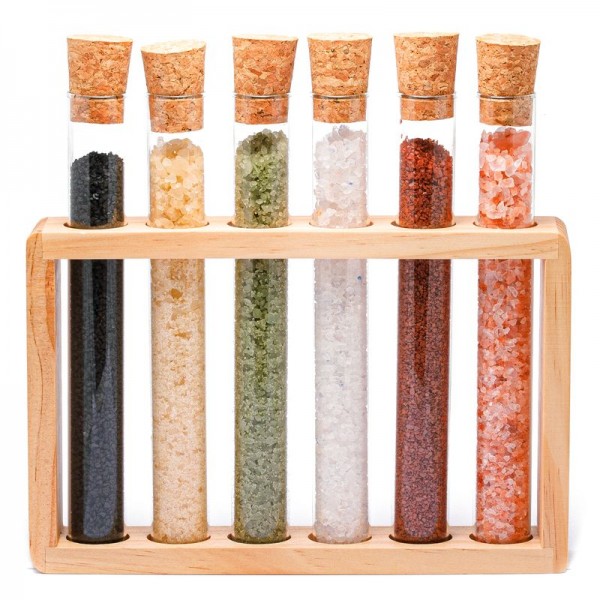 Il set con le sei fiale in vetro, contiene per ognuna: sale nero black lava, sale al limone, sale bamboo, sale blu di Persia, sale Hawaii, sale rosa. Il sale contenuto proviene da diverse tradizioni, ed è aromatizzato per donare una sensazione aromatica e di gusto sempre sorprendente. La confezione del set con le fiale in vetro contiene sali particolari e pregiati, adatti a molte pietanze.