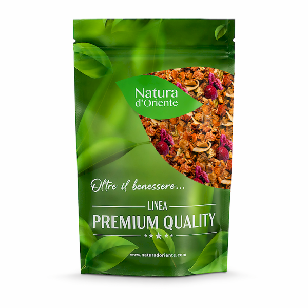 Una miscela intensamente aromatica e dal sapore dolce, che combina nell'infusione pezzi di mela e kiwi, ciliegie, mirtilli rossi e cocco, per una delle nostre infusioni più apprezzate. Ottima come infuso freddo, zuccherato naturalmente grazie al cocco che lo rende leggermente dolce e adatto a tutte le età. Si abbina bene con il dessert e la frutta, è un piacere dopo i pasti, specialmente in estate servito fresco per reintegrare liquidi e nutrienti preziosi. Perfetto anche in inverno, nelle giornate grigie per evocare aromi esotici e caldi della bella stagione. Questa raffinata miscela di frutti essiccati viene ulteriormente arricchita da succosi mirtilli rossi e pezzetti di mela.