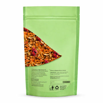 La miscela contiene molti elementi nutrizionali, componenti fenolici, carotenoidi e vitamina C, vitamina A, e vitamina E. Rende disponibili sali minerali come potassio, ferro, fosforo, manganese. Altri principi attivi sono i polifenoli antociani e zuccheri naturali. Come adoperare gli ingredienti nell'infusione L'infuso si ottiene inserendo in una tazza (250 ml), circa 3-5 grammi la miscela di ciliegia, kiwi e cocco con acqua a 100 °C. Lascia in infusione dai 10 ai 12 minuti, prima di bere. Aggiungi miele o zucchero, se lo desideri.