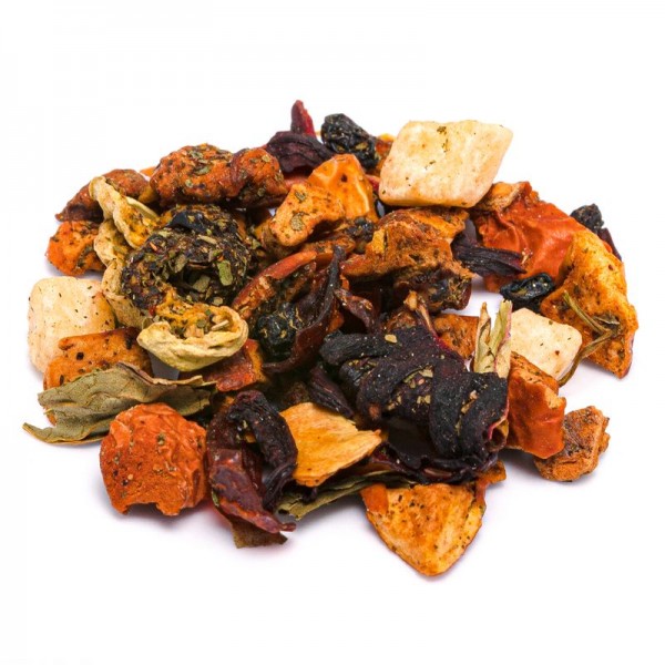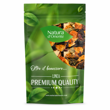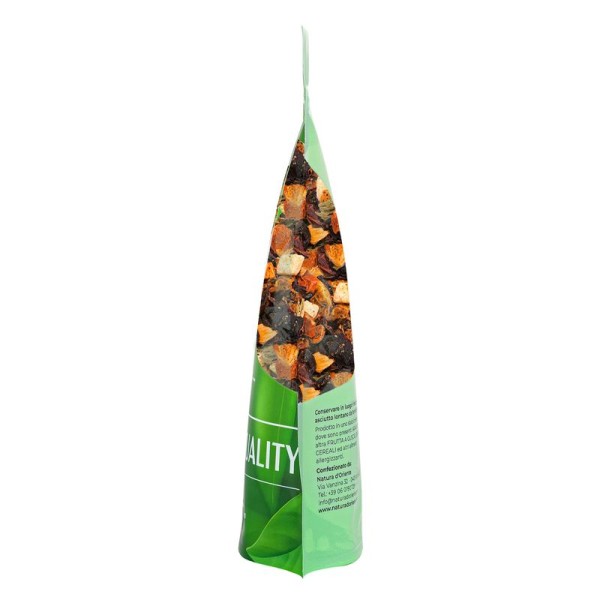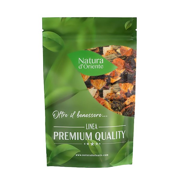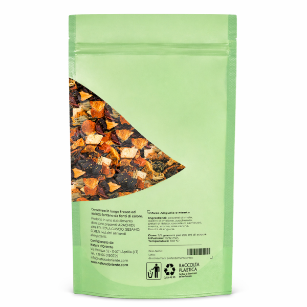 Le componenti dell'infusione sono tante, e il misto racchiude frutti e fiori di varia provenienza. L'anguria deriva dalla pianta Citrullus lanatus, che appartiene alla famiglia delle Cucurbitacee (la stessa di alcuni ortaggi come il cetriolo, la zucca e il melone). Le piante di questa famiglia portano fiori maschili e femminili separati sulla stessa pianta. Si presenta con viti sottili, ricoperte di piccoli peli e ramificate. La pianta produce fiori gialli solitari e il frutto grande, da sferico a oblungo. È la parte commestibile dell'anguria, data dall'ovario maturo formato da polpa acquosa e scorza dura. L'anguria viene consumata come un frutto, ma è comunque classificata come un ortaggio. La menta o Mentha è una pianta erbacea della famiglia Lamiaceae. Possiede fino a 24 specie, e tante varietà, tutte con proprietà erboristiche simili. Sono noti molti ibridi della menta, utilizzati principalmente per l'alimentazione. La pianta cresce fino a circa 1-2 metri di altezza, con le celebri foglie che mostrano un margine seghettato. Possiede una radice sotterranea (rizoma) carnosa, e i fiori nascono in spighe sottili. Il Melone deriva dalla pianta rampicante Cucumis melo, della famiglia delle zucche (Cucurbitaceae). Cresce bene nei climi temperati e caldi, mostrando grandi foglie e fiori gialli unisessuali. Botanicamente, i frutti commestibili sono un tipo di bacca dalla scorza dura, che varia in termini di dimensioni, forma, consistenza e colore (giallastri, bianchi, bruni, verdastri, a strisce longitudinali). Il sapore della polpa può variare a seconda della varietà: alcune quando maturano emanano un dolce odore fruttato, altre sono meno dolci ma pił morbide. La Rosa è una pianta della famiglia Rosaceae, famosa per i suoi fiori profumati, che variano in base alle tante varietà. La maggior parte delle specie di rosa derivano dall'Asia, e declinano in migliaia di cultivar. La pianta può prendere forma di arbusti eretti o rampicanti. Il falso frutto della pianta di Rosa canina, detto cinorrodo, si mostra come una bacca di colore rosso o arancione. Contiene gli acheni, i frutti veri e propri, ed è una ricca fonte di vitamina C. Il frutto della mela deriva dalla pianta Malus domestica, appartenente alla famiglia delle Rosacee. è un albero originario dell'Asia, molto diffuso in tutto il mondo per il valore nutrizionale dei frutti. Le mele si diversificano nei tanti colori e nelle numerose varietà, e sono adoperate nell'alimentazione umana da millenni. La pianta Sambucus nigra europeo, appartiene al genere Sambucus (famiglia Adoxaceae). è un arbusto diffuso in Europa e in Asia occidentale, che cresce in luoghi umidi e soleggiati. Gli alberi di sambuco raggiungono un'altezza di circa 15 metri e possono vivere per circa 60 anni. Ogni fiore diventa una piccola bacca nero-violacea, apprezzata per le sue proprietà nutrizionali. La pianta dell'ibisco è l'Hibiscus che appartiene alla famiglia Malvaceae. Si presenta sotto forma di numerose specie di erbe, arbusti e alberi. Queste piante sono originarie delle regioni calde temperate e tropicali. I fiori dell'ibisco, colorati e suggestivi, durano solo un giorno. Noti per le loro proprietà, vengono adoperati per gli infusi o per creare l'ibisco disidratato.