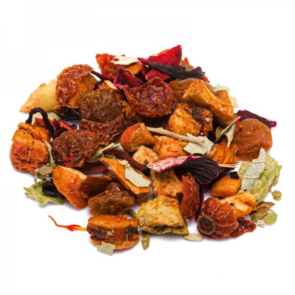 Riscaldante e deliziosa, la miscela dona un'importante aggiunta di benefici per il nostro organismo. Assumendo questo infuso si ottengono diverse virtù dei frutti tra uva, mela, cinorrodo, e componenti vegetali salutari come ibisco, foglie di mora e fiori di cartamo. La miscela rappresenta per il corpo un trattamento di benessere grazie all'abbondanza di ibisco e rosa canina, che la rendono una tisana ringiovanente. Contiene numerosi principi attivi, fra cui le vitamine A e C, per il benessere della pelle e per contribuire a rafforzare le difese immunitarie.