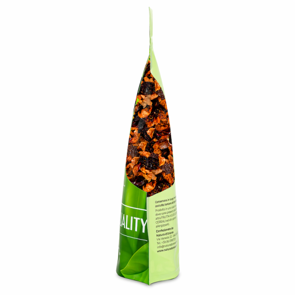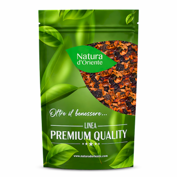 Le componenti dell'infusione sono tante, e il misto racchiude foglie e fiori di diversa provenienza. L'ibisco o Hibiscus è una pianta da fiore che appartiene alla famiglia delle Malvacee. Il genere dell'Hibiscus comprende centinaia di specie, tutte originarie delle regioni del mondo calde temperate, subtropicali e tropicali. I grandi fiori e queste specie, sono quelli utilizzati nell'erboristeria per le loro proprietà, essiccati e poi infusi. La ciliegia è il frutto della pianta del genere Prunus, presente in diverse varietà. È un albero appartenente alla famiglia delle Rosacee, originario di vari territori tra cui l'Europa, il Nord Africa e l'Asia. Il frutto rappresenta una drupa carnosa (frutto a nocciolo), che nasce solitamente dalle varietà del ciliegio dolce Prunus avium o del ciliegio l'aspro Prunus cerasus. La Rosa è una pianta della famiglia delle Rosaceae, originaria dell'Asia. Esistono centinaia di specie e migliaia di cultivar di questa pianta perenne, famosa per i suoi profumati fiori. Può presentarsi sotto forma di arbusti eretti, rampicanti, con o senza spine sugli steli. I frutti detti cinorrodi sono quelli della spontanea Rosa canina. Si tratta di falsi frutti ovali e carnosi, di color arancione o rosso, che contengono gli acheni, i veri frutti giallo-marroni. La pianta Malus domestica della famiglia delle Rosaceae, è l'albero che dona le mele. È originaria dell'Asia, diffusa e coltivata ormai in tutto il pianeta. I frutti si diversificano nei colori e nelle tante varietà, e sono utilizzati nell'alimentazione umana da millenni per le loro proprietà nutrizionali. L'uva è il frutto della Vitis Vinifera, che dona i suoi grappoli. È una pianta conosciuta da millenni, probabilmente originaria dell'India, e che si diffuse prima in Asia e poi nel bacino del Mediterraneo.