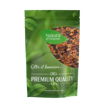 Le componenti dell'infusione sono tante, e il misto racchiude foglie e fiori di diversa provenienza. L'ibisco o Hibiscus è una pianta da fiore che appartiene alla famiglia delle Malvacee. Il genere dell'Hibiscus comprende centinaia di specie, tutte originarie delle regioni del mondo calde temperate, subtropicali e tropicali. I grandi fiori e queste specie, sono quelli utilizzati nell'erboristeria per le loro proprietà, essiccati e poi infusi. La ciliegia è il frutto della pianta del genere Prunus, presente in diverse varietà. È un albero appartenente alla famiglia delle Rosacee, originario di vari territori tra cui l'Europa, il Nord Africa e l'Asia. Il frutto rappresenta una drupa carnosa (frutto a nocciolo), che nasce solitamente dalle varietà del ciliegio dolce Prunus avium o del ciliegio l'aspro Prunus cerasus. La Rosa è una pianta della famiglia delle Rosaceae, originaria dell'Asia. Esistono centinaia di specie e migliaia di cultivar di questa pianta perenne, famosa per i suoi profumati fiori. Può presentarsi sotto forma di arbusti eretti, rampicanti, con o senza spine sugli steli. I frutti detti cinorrodi sono quelli della spontanea Rosa canina. Si tratta di falsi frutti ovali e carnosi, di color arancione o rosso, che contengono gli acheni, i veri frutti giallo-marroni. La pianta Malus domestica della famiglia delle Rosaceae, è l'albero che dona le mele. È originaria dell'Asia, diffusa e coltivata ormai in tutto il pianeta. I frutti si diversificano nei colori e nelle tante varietà, e sono utilizzati nell'alimentazione umana da millenni per le loro proprietà nutrizionali. L'uva è il frutto della Vitis Vinifera, che dona i suoi grappoli. È una pianta conosciuta da millenni, probabilmente originaria dell'India, e che si diffuse prima in Asia e poi nel bacino del Mediterraneo.