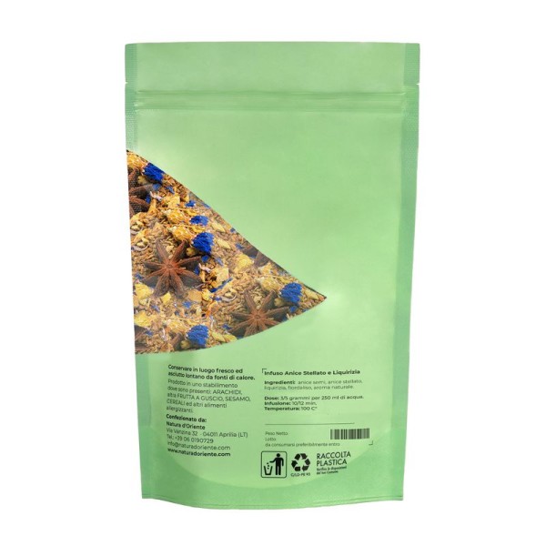 È una pianta erbacea perenne originaria dell’Asia sudoccidentale e dell’area mediterranea, nota per le sue radici che donano il composto dolce per la pasticceria, la glicirrizina. Il nome deriva dal greco “radice dolce”. Per crescere la pianta di liquirizia richiede un terreno profondo, ben coltivato, fertile e ricco di umidità. La crescita delle piante è inizialmente lenta, ma una volta stabilita, può diventare infestante. Valori nutrizionali dell'infuso con anice stellato e liquirizia. L'anice contiene fibra alimentare, sali e minerali come potassio, calcio, ferro, magnesio. Inoltre, dispone di vitamine A, B6, C. i suoi principi attivi più noti sono l'anetolo e l'acido shikimico. La liquirizia, invece, contiene anch'essa vitamine del Gruppo B (vitamina B1, B2, B3 e B5), vitamina E e discrete quantità di calcio, ferro, fosforo, potassio, magnesio e zinco.
