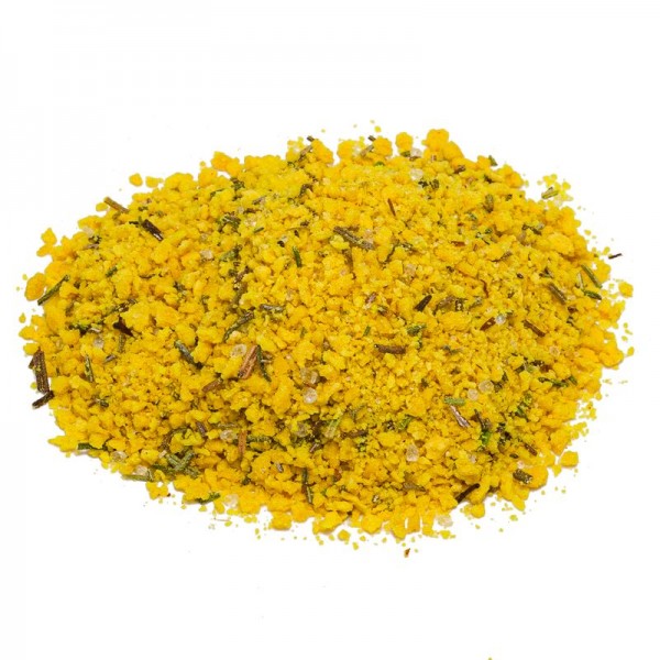 Questo mix per gratinatura con bucce di limone è disponibile sia in questa versione col rosmarino che in un’altra versione col prezzemolo. In entrambi i casi la paprika e la curcuma aggiungono un pizzico di esoticità e di piccante a due sapori tipici della cucina italiana.
