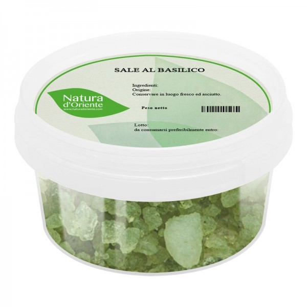 Si fa in modo che il sale cristallizzi fino al punto di saturazione, e poi il deposito di sale viene raccolto quando raggiunge un certo spessore. Con questo metodo, la purezza del sale si avvicina al 100%. Il sale grezzo o integrale, potrà essere sottoposto a vari processi di trasformazione necessari o ulteriori - lavaggio, essiccazione e setacciatura. Nella preparazione del sale aromatizzato, l'estratto di basilico naturale viene mescolato con il sale, rendendolo verde brillante come la pianta. Si usa questa pianta erbacea aromatica per la sua ampia diffusione in cucina, crescendo in tutte le regioni calde e temperate del mondo.