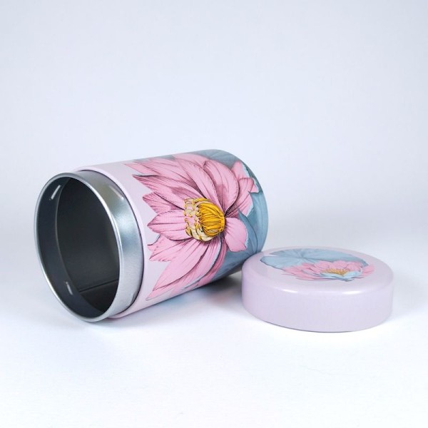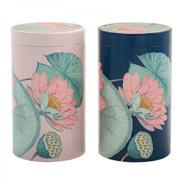 Il contenitore rotondo in latta mantiene in modo ermetico le foglie di tè, gli ingredienti essiccati per tisane e infusi. Grazie al suo coperchio ben richiudibile, garantisce l'integrità del contenuto e lo protegge da umidità, calore, aria. Il design di ispirazione floreale è disponibile in due colori, rosa e blu, evocando le tonalità tipiche del mondo delle ninfee, già riprodotte nei capolavori della pittura di inizio Novecento