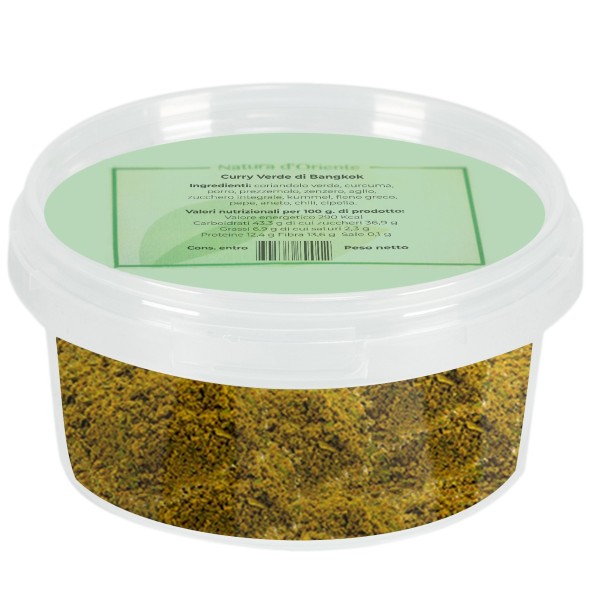 Questa delizia della cucina thailandese, poco nota nel mondo occidentale, si distingue per il profumatissimo aroma e il colore. Il verde brillante deriva dal coriandolo verde che compone il curry. In questa versione in polvere, il preparato di condimento thai contiene peperoncini non molto piccanti e una miscela di spezie ed erbe aromatiche: un perfetto equilibrio di note salate, dolciastre, piccanti e aspre. Il condimento che si ottiene è leggero, poco piccante ed altamente profumato, con sentori erbacei e vegetali.