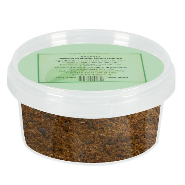 Sappiamo che il Baharat comprende spezie che possono variare da regione a regione, ma in generale è una combinazione di pimento, pepe nero, noce moscata, cumino, coriandolo, paprika, cannella, cardamomo e chiodi di garofano. Nella nostra proposta di miscela speziata libanese è arricchita con kummel (cumino dei prati) e aglio.
