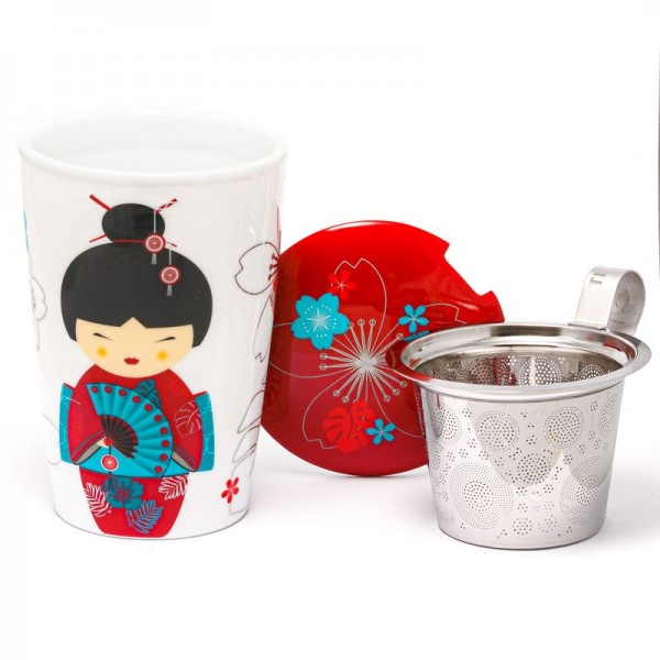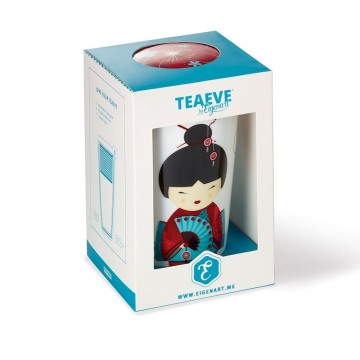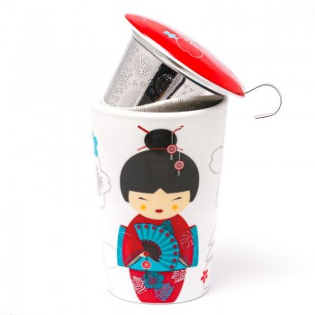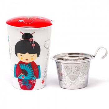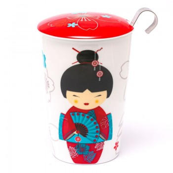 Lo stile della mug in porcellana è ispirato al Giappone, rappresentando la geisha, simbolo legato al rituale del tè nel Sol Levante. La decorazione mostra su tre diversi colori, un'elegante geisha con delicati rilievi, anche sul coperchio. La cerimonia del tè, storicamente veniva tenuta nelle case del tè dalle geishe, che ricevevano gli ospiti accompagnando il rituale con conversazioni, danze, musiche della cultura tradizionale giapponese. Le tonalità disponibili per la tazza con Geisha cono celeste, rosa e rosso - i ogni versione cambiano anche i rilievi e i motivi del design.