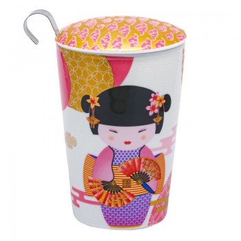 Lo stile della mug in porcellana è ispirato al Giappone, rappresentando la geisha, simbolo legato al rituale del tè nel Sol Levante. La decorazione mostra su tre diversi colori, un'elegante geisha con delicati rilievi, anche sul coperchio. La cerimonia del tè, storicamente veniva tenuta nelle case del tè dalle geishe, che ricevevano gli ospiti accompagnando il rituale con conversazioni, danze, musiche della cultura tradizionale giapponese. Le tonalità disponibili per la tazza con Geisha cono celeste, rosa e rosso - i ogni versione cambiano anche i rilievi e i motivi del design.