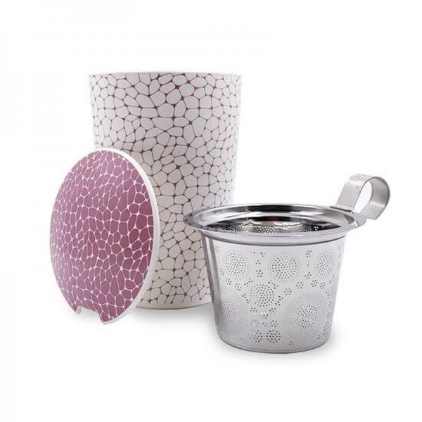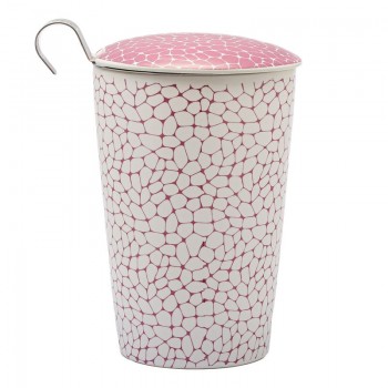 Lo stile di questa tazza da tè si ispira alle decorazioni minimaliste ed eleganti, con linee e intrecci di colore. Troverai la tazza in porcellana sia nella tonalità viola e avorio (linee chiare su fondo intenso), sia con la cromia bianca di fondo e le linee rosa che la solcano. In ogni caso, il coperchio presenta la decorazione inversa nei colori, per uno stile vivace. Rappresenta, così, l'accessorio perfetto per una cucina moderna e colorata, la mug per una scrivania creativa e per dare un tocco brillante in ogni degustazione.