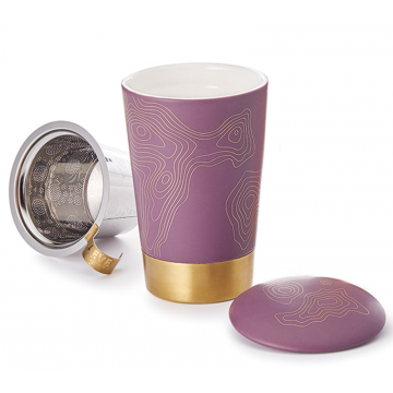 L'esperienza del tè diventa un piacere per tutti i sensi, visto che la decorazione è tattile. La tazza da tè in porcellana viene decorata con colori brillanti e, che presentano elementi sia opachi che lucidi. Alcuni dei dettagli di alta qualità del disegno sono tangibili; la speciale finitura dona la sensazione di morbidezza vellutata al tocco mentre sorseggi. Altri elementi sono in rilievo, sulla superficie liscia della porcellana, per il piacere visivo e tattile. In particolare le linee dorate che percorrono la tazza e ne formano la base. Lo stile di queste mug è veramente raffinato, minimalista ed elegante - adatto per una cucina moderna o classica. L'inserto dorato nella base e nelle venature si combina sia con il colore rosa tenue sia con il viola, per un effetto più glamour. Le linee dorate sono quasi dei percorsi, delle mappature misteriose che rendono la mug affascinante.