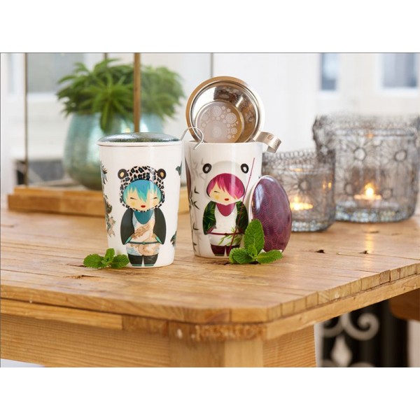 La mug combina un design veramente unico con la praticità di una tazza in porcellana a doppia parete. Questo dettaglio costruttivo la rende una tazza termica, e permette di mantenerla piacevolmente tiepida e maneggevole all'esterno, mentre rimane calda all'interno. Un sistema che consente al tè o alla tisana di preservarsi più a lungo negli aromi e nel sapore, grazie al calore che rimane trattenuto. Questo accade anche grazie al coperchio in porcellana annesso, che migliora l'isolamento termico della bevanda una volta richiuso. La tazza da tè con filtro inossidabile Un vantaggio di questa mug è quello di possedere un colino inserito all'interno, perfetto per la preparazione delle foglie sfuse o degli ingredienti di una tisana. Il filtro in acciaio Inox presenta un manico con impugnatura, veramente comodo per la rimozione del colino. Inoltre il coperchio funge come superficie di appoggio per il colino stesso una volta rimosso. L'acciaio inossidabile è sicuro a livello alimentare, e pratico per l'infusione, oltre ad essere finemente decorato. La forma del filtro a cestello aiuta a preparare il tè o la tisana direttamente nella tazza, con la sicurezza di una foratura stretta per gli elementi più piccoli.