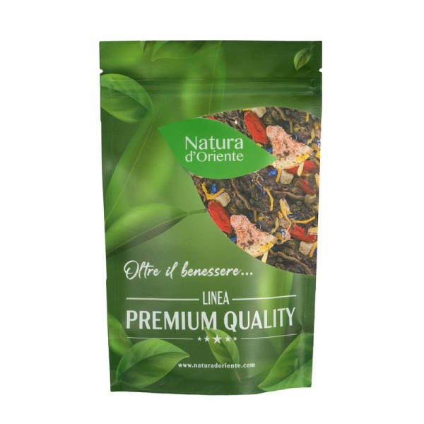 L'incantevole tè Oolong aromatizzato di questa miscela si combina con una selezione di frutti esotici, evocando atmosfere originali e “paradisiache”. Fin dal primo sorso, si percepiscono gli ingredienti fruttati e floreali, che stimolano i sensi in modo delizioso. Il tè oolong cinese, dal sapore dolce e complesso, è la base per l'infuso succulento di papaya, pesca, bacche di goji e fico, dal gusto fresco e zuccherino. La delicata fragranza della papaya e della pesca si fa sentire nell'aria, evocando la bella stagione se gusti questo tè oolong in inverno. Otterrai note profonde e complesse, tra fruttate e floreali, anche grazie alle dolci bacche di goji e alla delicatezza del fico, la freschezza dei fiori di calendula e fiordaliso. Gustato freddo, questo tè oolong disseta e soddisfa la sensazione rigenerante e rinfrescante del tè freddo. Il tè oolong melograno, pesca e bacche di goji concede una pausa dal sapore equilibrato, deliziosa all'assaggio e dotata di una consistenza vellutata al palato. La dolcezza persistente di questo tè oolong lo rende perfetto per un momento di piacere e relax, oltre che per un vivace tea time in compagnia.